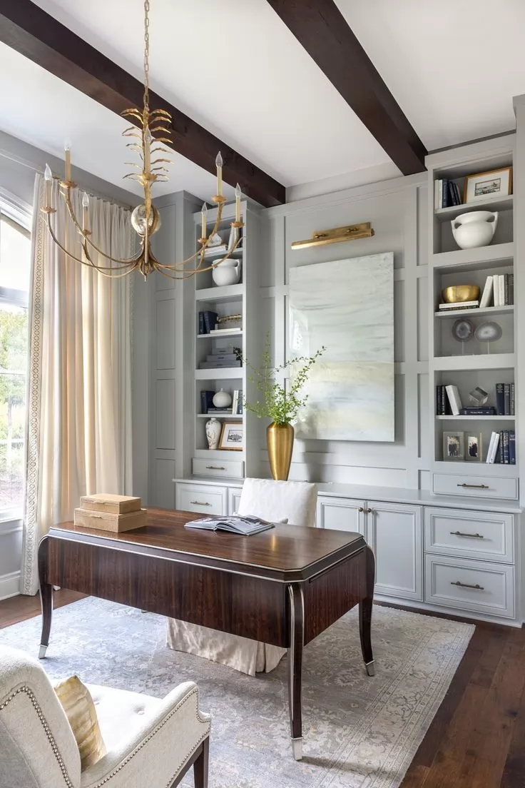 مع مكتب ثقيل من الخشب و ارضيات ناصعة البياض .