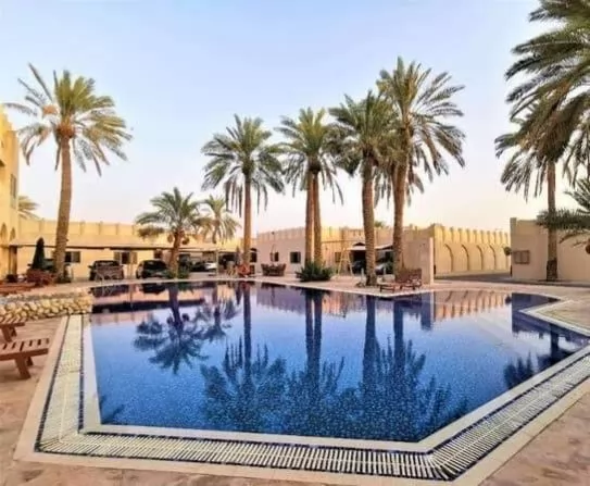 The villa is characterized by its simple architectural design that matches its exterior design, as the color of the cladding has been unified to a light beige color, in addition to palm trees found everywhere, and Arabic trimmings around the pool tiles.